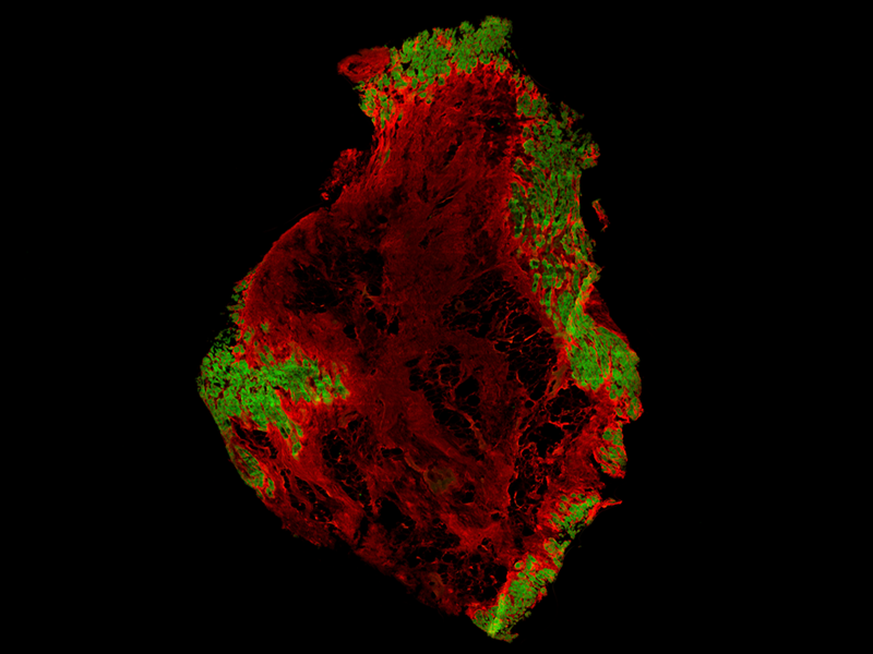 The scar tissue, shown in red within this image, cannot function like the normal heart cells, pictured in green. As a result, the heart’s ability to pump can be permanently impaired, meaning that some people develop heart failure. Researchers used coloured dyes to stain heart tissue, making healthy and scarred areas visible in the image. They aim to understand how healthy cells are replaced by scar tissue over time, and to find ways to stop this process, in order to help keep the heart beating normally.