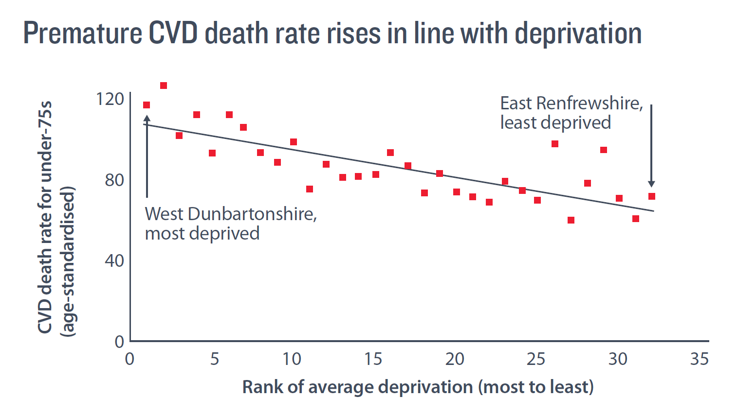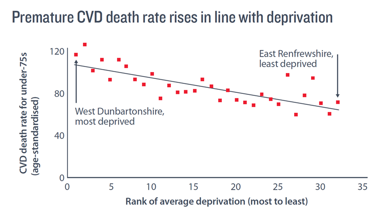 For instance, people living in the local authority with the highest level of average deprivation – West Dunbartonshire – are 1.6 times more likely to die prematurely from CVD compared with people in East Renfrewshire, which has the lowest average deprivation in Scotland.9