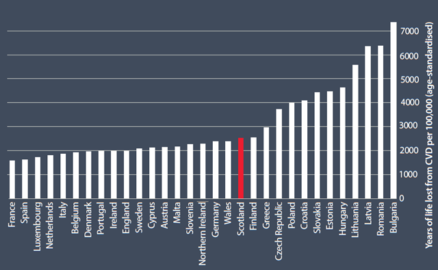 Despite decades of success bringing down the premature CVD death rate, Scotland still ranks lower than 18 other EU nations – behind Slovenia, Cyprus and Malta.