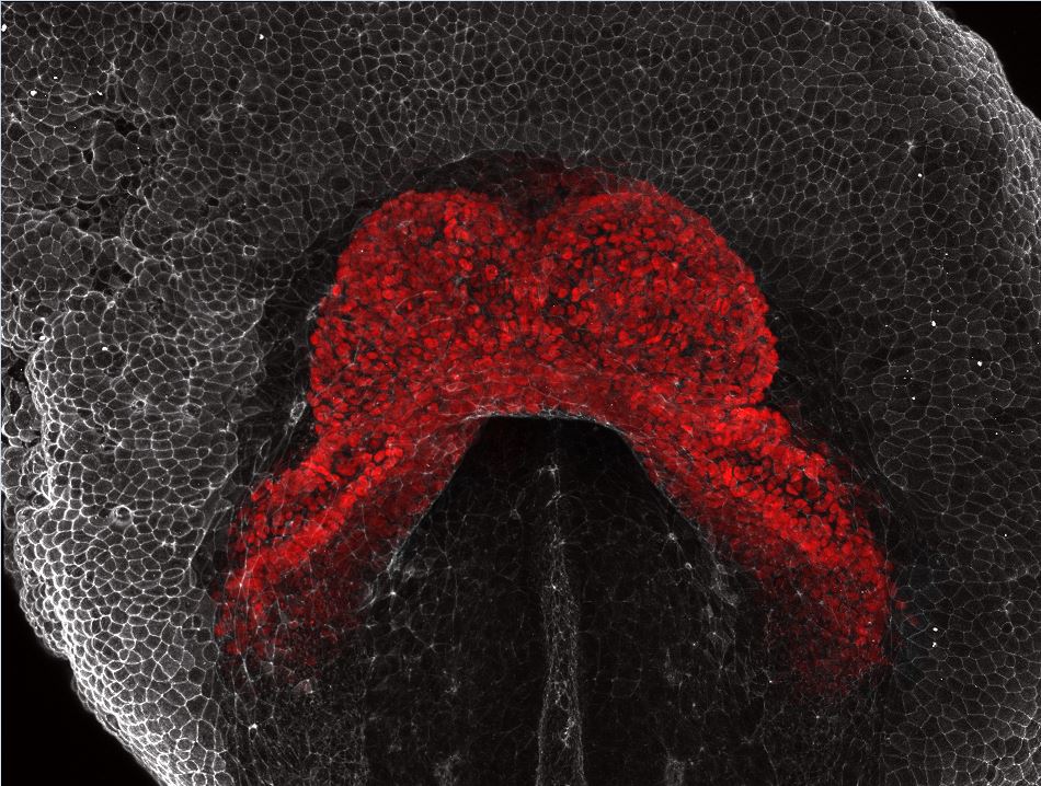 The runner-up came from Dr Richard Tyser, a BHF Immediate Postdoctoral Research Fellow at the University of Oxford. This image shows the heart in a developing mouse embryo. In red are the heart cells and in grey are the cells which make up the rest of the mouse embryo. During early development, the heart initially forms this crescent-like shape and it starts to beat.