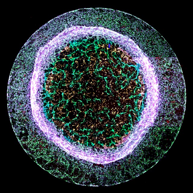 In August we announced the winner of our annual national science image competition ‘Reflections of Research’. This year’s winner was Dr Elisa Avolio from the University of Bristol with an incredible image that appears at first glance to resemble a luminous jelly fish, but in reality, shows new blood vessel-like structures (pictured in green in the centre) sprouting from a 3D gel.