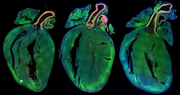These glowing hearts show the effects of stimulating mouse hearts to regenerate. The two hearts on the right have been injected with microRNAs (small molecules that turn genes off), which cause heart muscle cells to multiply. This stimulation thickens the heart muscle, making it stronger. The heart on the left-hand side looks smaller as it has not been given these microRNAs.