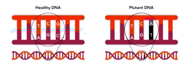 There are 3 billion base pairs in human DNA. These can become damaged, and mistakes can occur when DNA is copied as the cell divides. Such mistakes are called mutations.